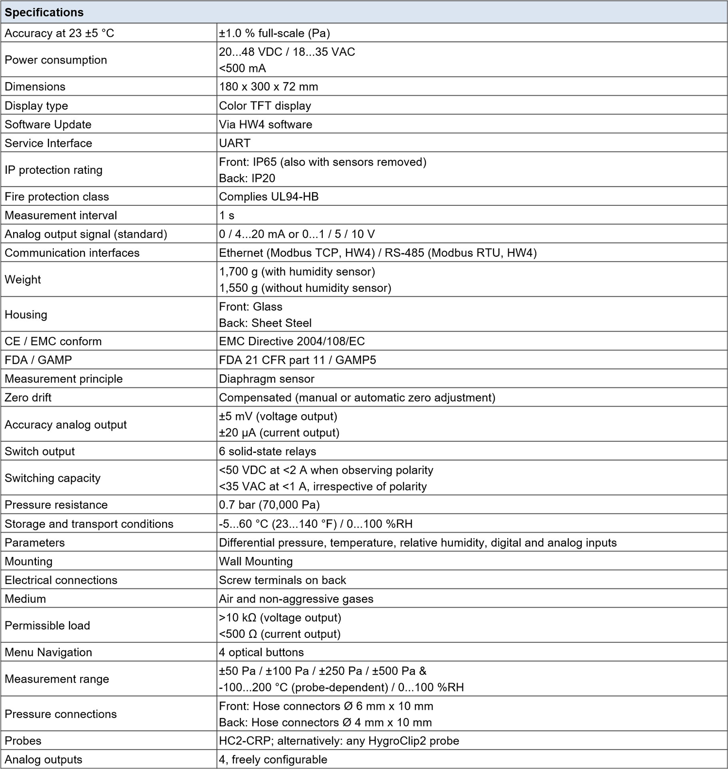 The CRP1 Clean-room Panel is characterized by its compact construction and simple handling. Its HygroClip2-compatibility allows humidity to be registered to the highest degree of accuracy. The data can be transferred via analog outputs or MODBUS. Measured values, alarms and measurement curves are shown on the display.