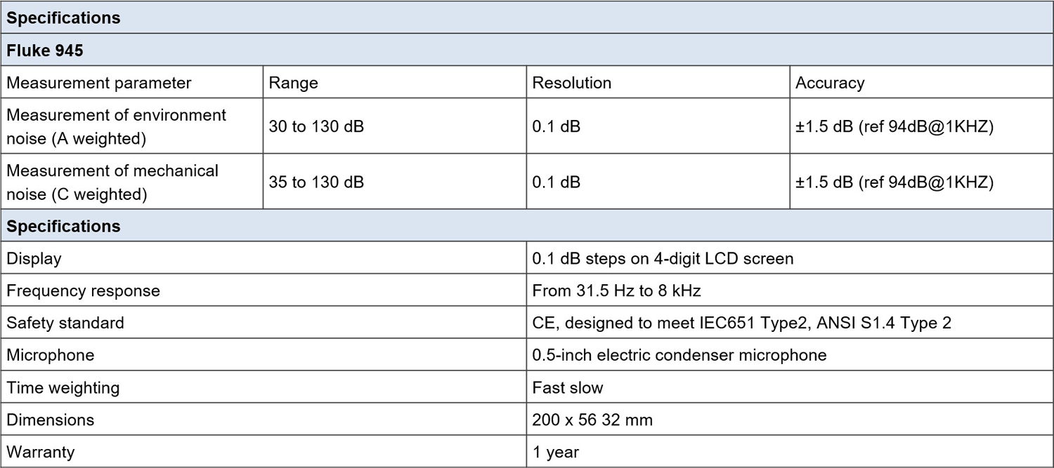 The Fluke 945 Sound Level Meter has been designed to meet the measurement requirements of safety Engineers, Health, Industrial safety offices and quality control in a wide variety of industrial environments. It offers two types of measurements: A weighting and C weighting. The A weighting is for general noise sound level and the C weighting is for measuring sound level of acoustic material control in various environments. The Fluke 945 conforms to the IEC651 Type 2, ANSI S1.4 Type 2, and JISC1502 requirements for Sound Level Meters.
