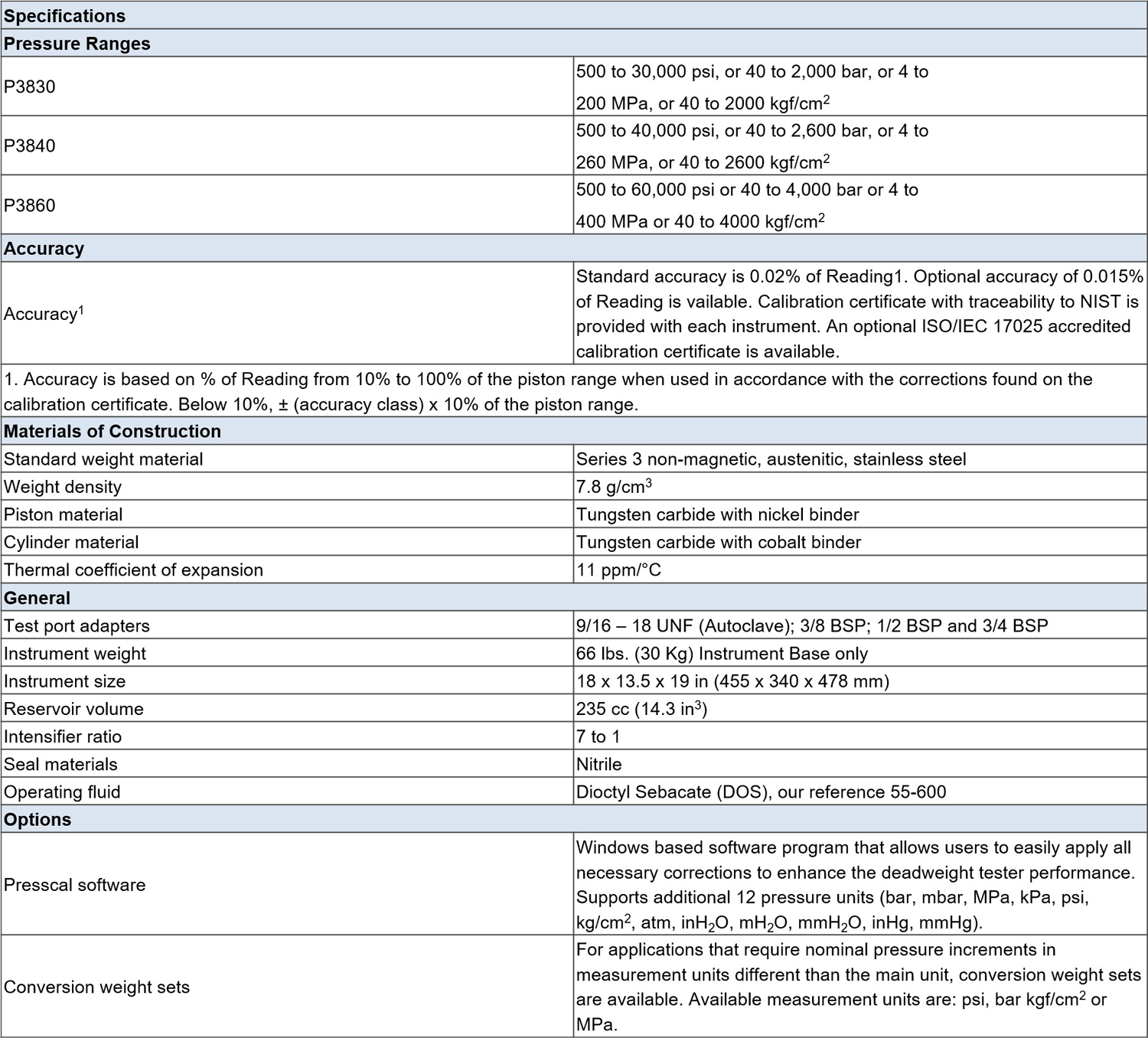Three models are available, P3830, P3840 and P3860 offering pressure ranges of 30,000, 40,000 and 60,000 psi respectively (2000, 3000 and 4000 bar). All models are available in two accuracy classes, 0.02% or 0.015% of Reading. The Series P3800 offers an accurate and economical approach to calibrating high pressure devices.