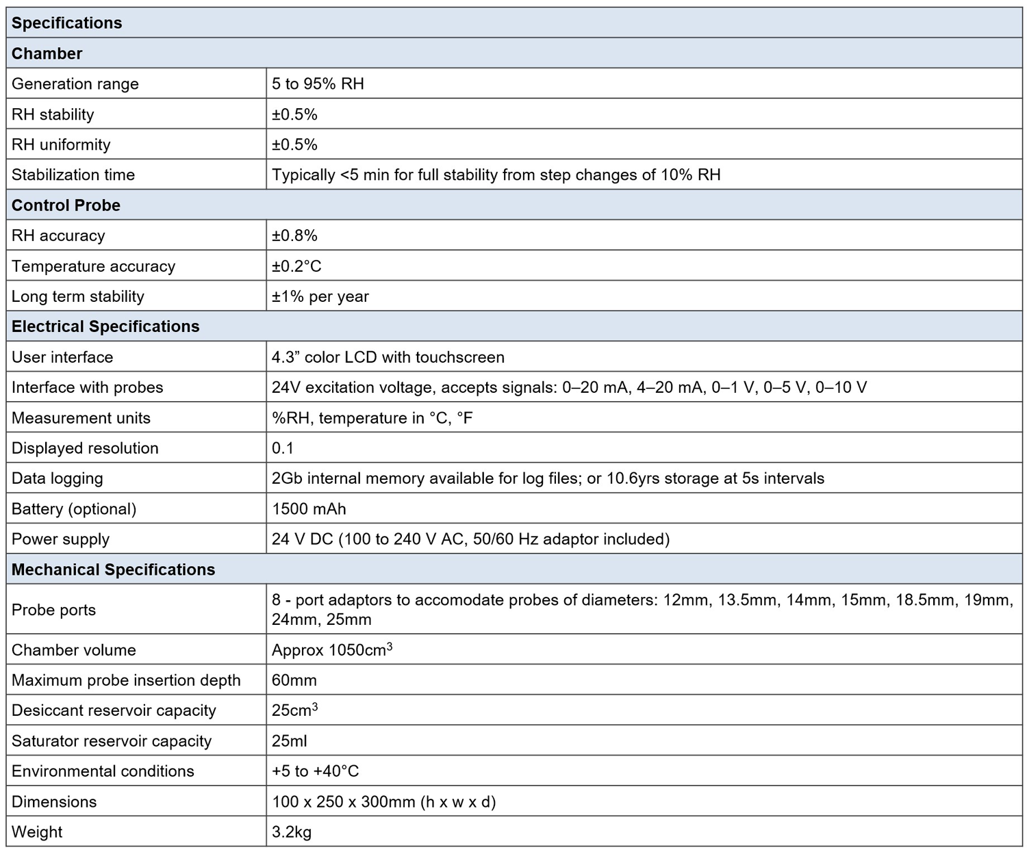 Its intuitive 4” touch screen display and interface allows the probes under test to be fully integrated with the chamber and user interface (UI), so up to 7 probes with a variety of diameters and output signals can be powered, monitored and logged simultaneously by one self-contained unit.
