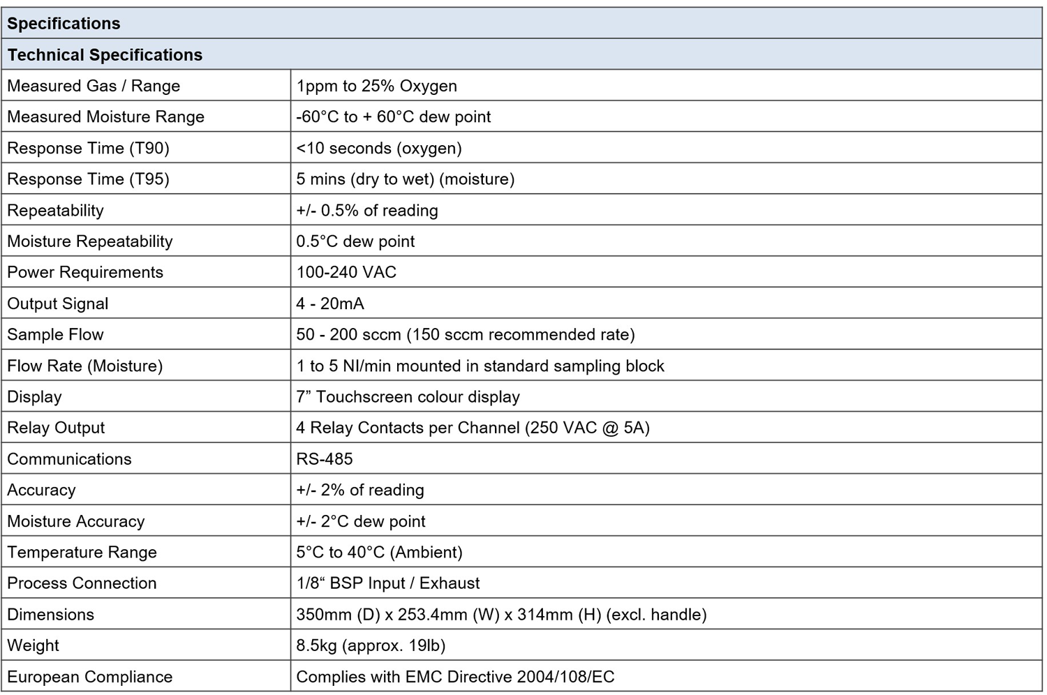 The AM Trace has a fast response time from 20.9% to low PPM Oxygen. AM Trace also incorporates a moisture sensor which allows measurement of moisture in the range of -60°C to +60°C. With touchscreen technology and front facing inputs / outputs this analyzer can be integrated into any system with ease.